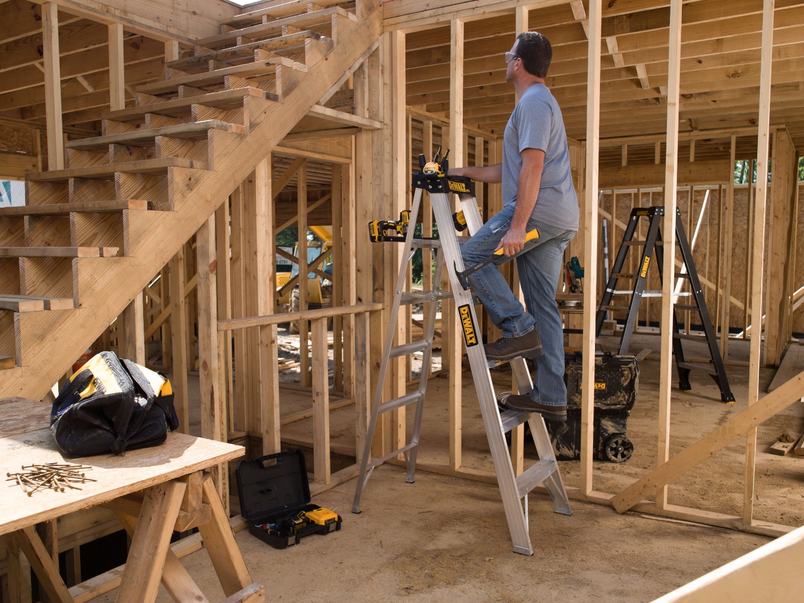 This 10-foot DEWALT aluminum step ladder has a load capacity of 300 lbs, rated ANSI Type IA. This ladder is equipped with a durable top with magnet and multiple tool slots, automatic closing pail shelf, slip-resistant aluminum shoes, heavy-duty gusset bracing, and has a 25% greater step surface. This DeWalt DXL2010-10 step ladder meets or exceeds the safety standards set by ANSI and OSHA.