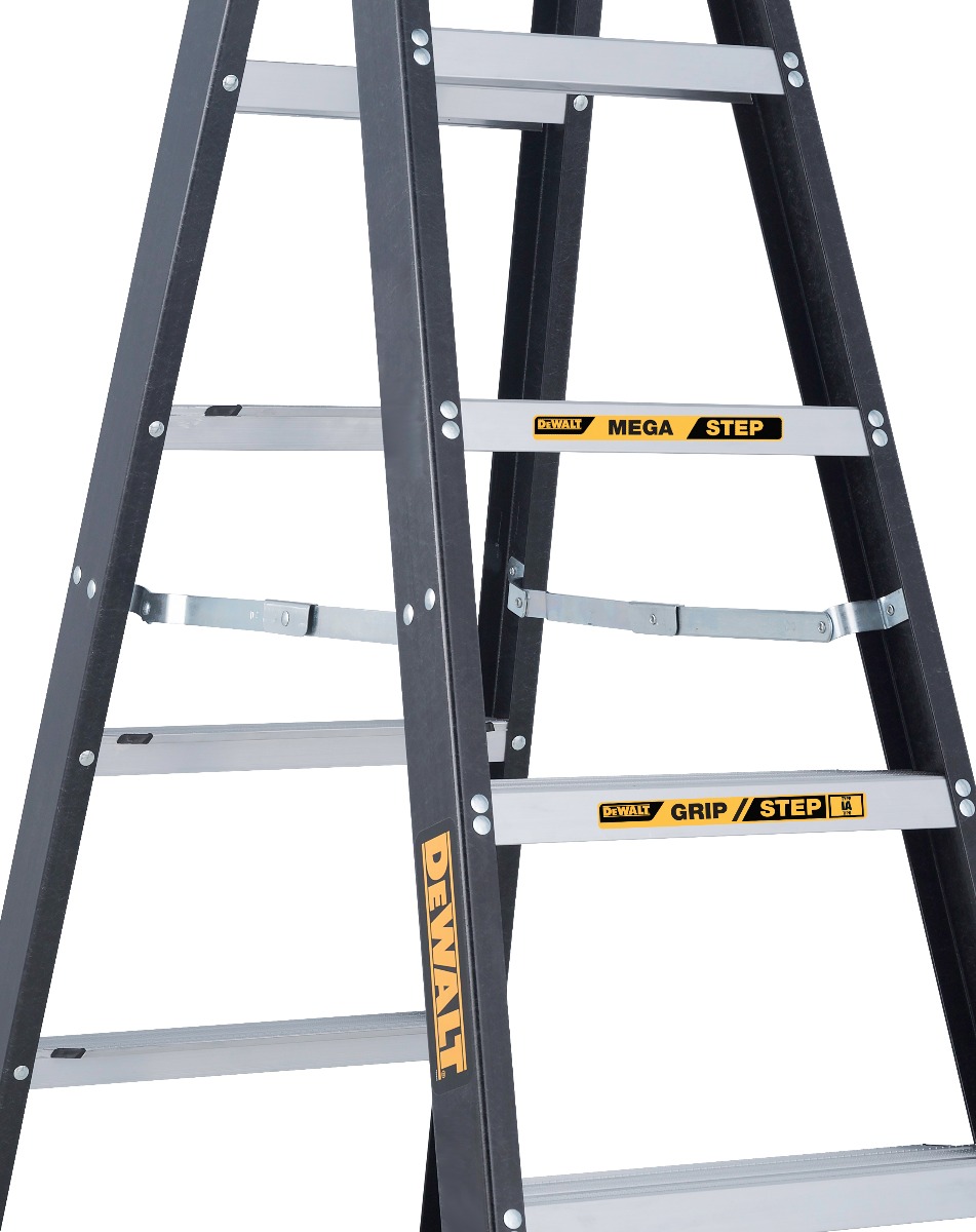 This 12-foot non-conductive DEWALT fiberglass twin front step ladder has a load capacity of 300 lbs, rated ANSI Type IA. The 300 lb load capacity applies to each side of the ladder and is built for use by two people (one per side) simultaneously. This ladder is equipped with an innovative and durable top with magnet and multiple tool slots, heavy-duty boots, an impact absorption system, and has a 25% greater step surface. This DeWalt DXL3030-12 twin step ladder meets or exceeds the safety standards set by ANSI and OSHA.