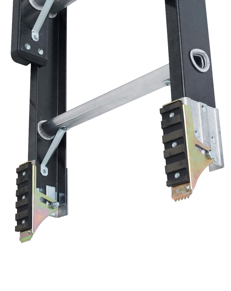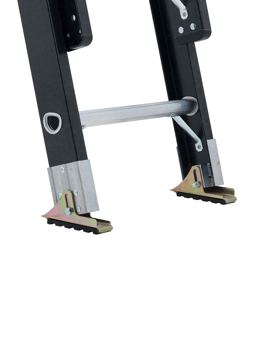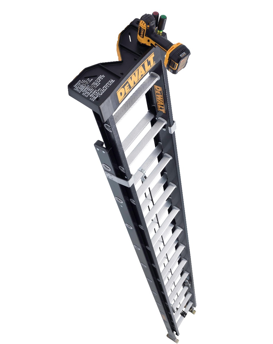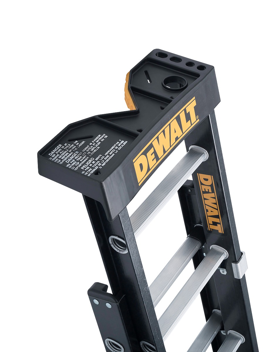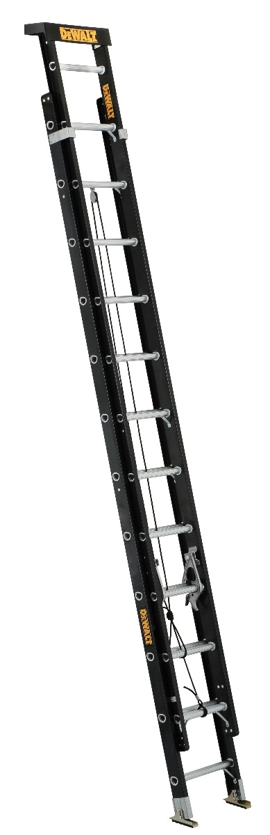 This 20-foot fiberglass DEWALT extension ladder has a 300-pound load capacity, rated ANSI Type IA. This ladder includes an advanced RungLock system that provides a simple, intuitive method of securing the fly and base sections of the ladder when extended. This ladder features outside slide guides, a non-marring durable V-shaped top with multiple tool slots and a slip-resistant rubber tread, D-shaped rungs fully serrated for a slip-resistant surface, and full heavy-duty metal boot with steel swivel safety shoes to be used with the tread down or in spike position. This DeWalt DXL3020-20PT fiberglass extension ladder meets or exceeds the safety standards set by ANSI and OSHA.