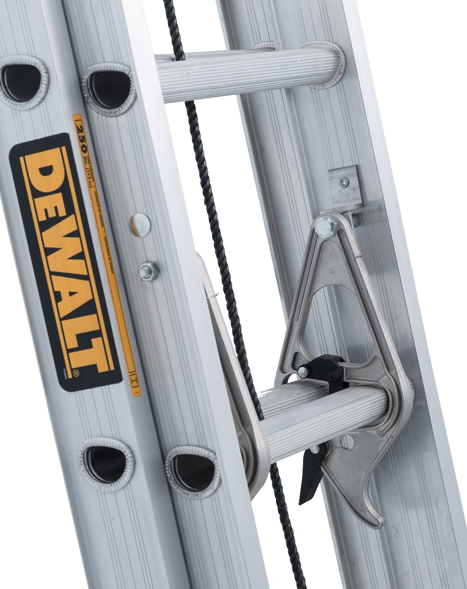 This 32 foot aluminum DEWALT extension ladder has a 250 ound load capacity, rated ANSI Type I. This ladder includes an advanced RungLock system that provides a simple, intuitive method of securing the fly and base sections of the ladder when extended. The ladder features D-shaped rungs fully serrated for a slip resistant surface, non-marring plastic hand grips, rope and pulley, and slip resistant aluminum shoes to be used with the tread down or in spike position. This DeWalt DXL2120-32 aluminum extension ladder meets or exceeds the safety standards set by ANSI and OSHA.