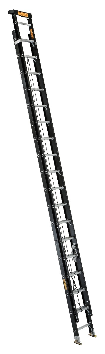This 36-foot fiberglass DEWALT extension ladder has a 300-pound load capacity, rated ANSI Type IA. This ladder includes an advanced RungLock system that provides a simple, intuitive method of securing the fly and base sections of the ladder when extended. This ladder features outside slide guides, a non-marring durable V-shaped top with multiple tool slots and a slip-resistant rubber tread, D-shaped rungs fully serrated for a slip-resistant surface, and full heavy-duty metal boot with steel swivel safety shoes to be used with the tread down or in spike position. This DeWalt DXL3020-36PT fiberglass extension ladder meets or exceeds the safety standards set by ANSI and OSHA.