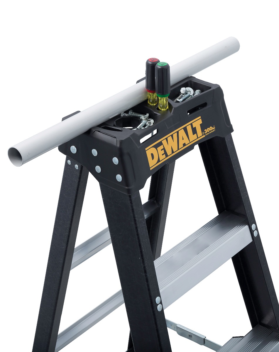 This 6-foot non-conductive DEWALT fiberglass step ladder has a load capacity of 300lbs, rated ANSI Type IA. This ladder features an innovative top with magnet and multiple tool slots, 25% greater step surface, an impact absorption system, heavy-duty boots with non-marring bonded tread mechanically fastened to the upper boot to create a secure slip-resistant footing, inside spreader braces, wide back braces, and double-rivet step construction. This DeWalt DXL3010-06 step ladder meets or exceeds the safety standards set by ANSI and OSHA.