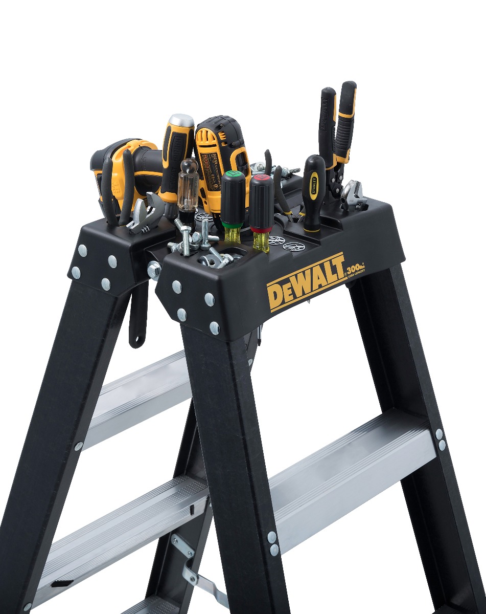 This 6-foot non-conductive DEWALT fiberglass twin front step ladder has a load capacity of 300 lbs, rated ANSI Type IA. The 300 lb load capacity applies to each side of the ladder and is built for use by two people (one per side) simultaneously. This ladder is equipped with an innovative and durable top with magnet and multiple tool slots, heavy-duty boots, an impact absorption system, and has a 25% greater step surface. This DeWalt DXL3030-06 twin step ladder meets or exceeds the safety standards set by ANSI and OSHA.