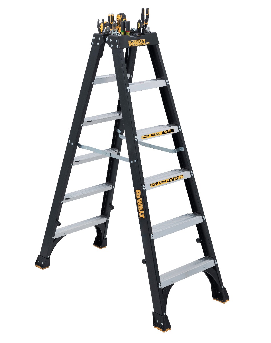 This 8-foot non-conductive DEWALT fiberglass twin front step ladder has a load capacity of 300 lbs, rated ANSI Type IA. The 300 lb load capacity applies to each side of the ladder and is built for use by two people (one per side) simultaneously. This ladder is equipped with an innovative and durable top with magnet and multiple tool slots, heavy-duty boots, an impact absorption system, and has a 25% greater step surface. This DeWalt DXL3030-08 twin step ladder meets or exceeds the safety standards set by ANSI and OSHA.