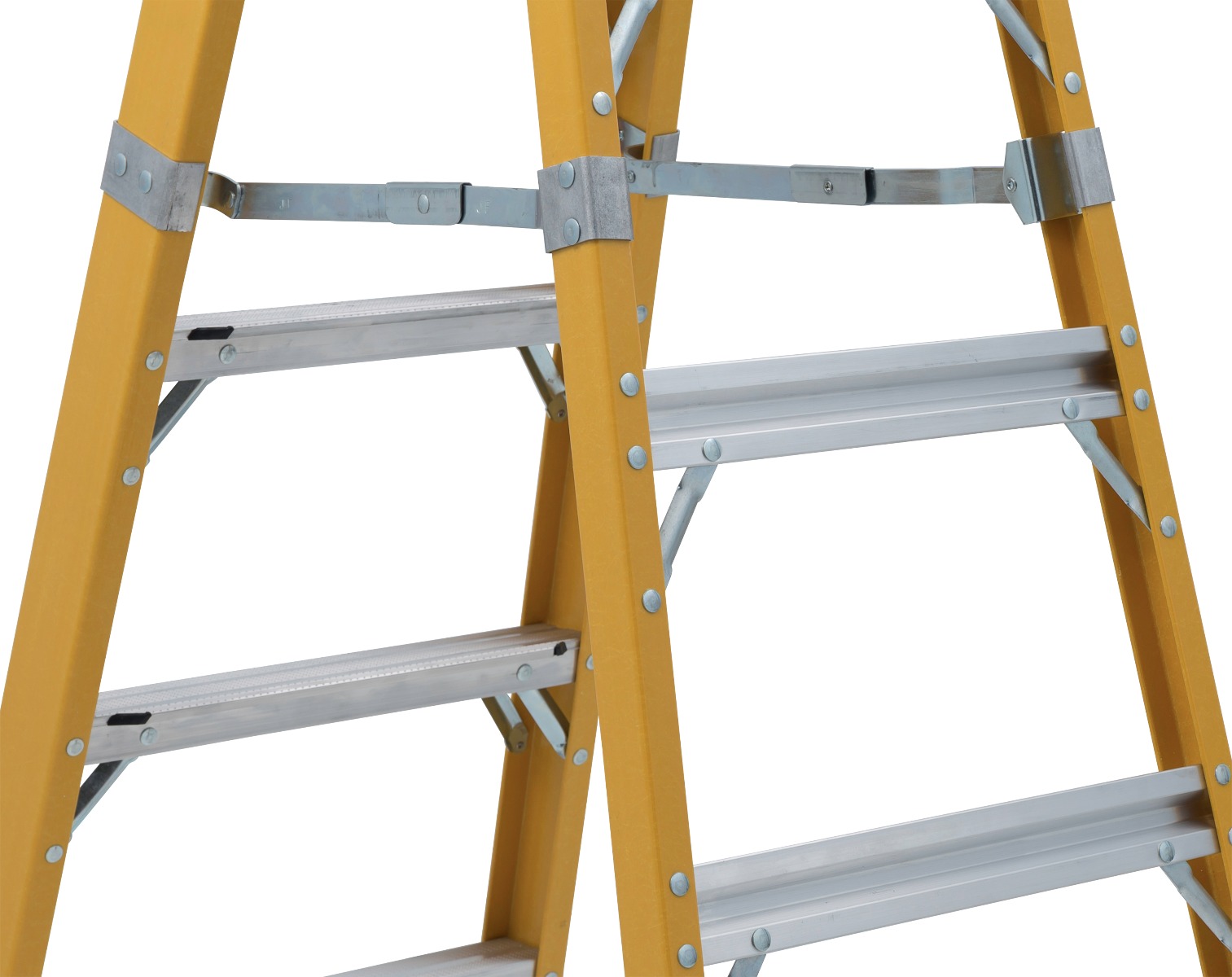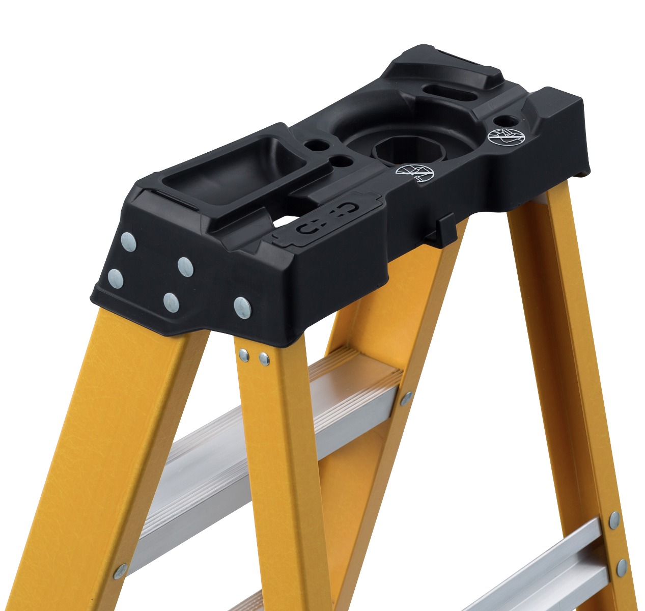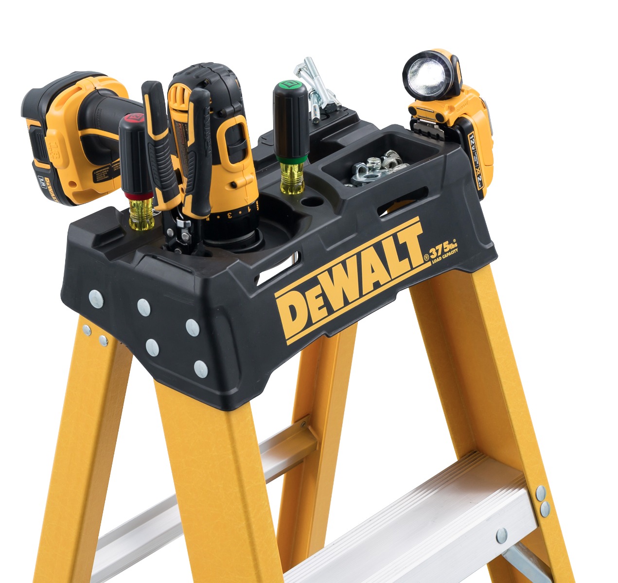 This 8-foot non-conductive DEWALT fiberglass step ladder has a 500lbs load capacity, exceeding ANSI Type IAA rating. This ladder features an extra heavy-duty metal top with tool slots and magnet, 25% greater step surface, an impact absorption system, heavy-duty boots with non-marring bonded tread mechanically fastened to the upper boot to create a secure slip-resistant footing, wrap-around internal spreader braces, wide back braces, and double-rivet step construction. This DeWalt DXL3810-08 step ladder meets or exceeds the safety standards set by ANSI and OSHA.