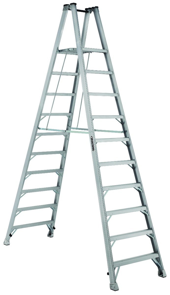 This Louisville 10 foot aluminum twin platform step ladder has a 300lb load capacity, rated ANSI Type IA. It features a slim, gapless slip-resistant platform with a top rail guard. This ladder can be used from both sides simultaneously. It is equipped with a heavy-duty gauge steel hinge, DaBoot with non-marring bonded tread mechanically fastened to the upper boot to create a secure slip-resistant footing, and double-rivet step construction. The Louisville AMP1010 twin platform step ladder meets or exceeds the safety standards set by ANSI and OSHA. Looking to add casters for easy mobility? Model AMP1010-4C comes pre-installed with casters.