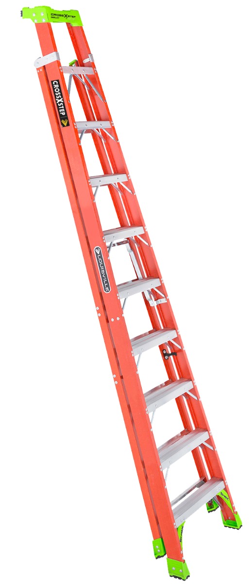 The industry changing Step-to-Extension 2-in-1 Cross Step Ladder is better than ever! Its HiVis green top and shoes makes it easily identifiable to prevent fines and improve workplace safety. SUPERIOR SAFETY: This 10-Foot Cross-Step/Shelf Ladder is made of superior quality, non-conductive fiberglass VERSATILE: Converts from a step ladder into a shelf ladder for a 2 in 1 combination in order to get closer to the work area PATENTED PRO-TOP SYSTEM: V-shape Pro Top allows the ladder to lean against walls, buildings and poles; and has plenty of features to improve performance when working electrical, construction, and residential jobs. It includes a magnet tray, hardware tray, drill and tool slots, and pipe or 2×4 holder. EQUIPPED WITH SHOX SYSTEM: Louisville Ladder exclusive SHOX system provides extra durability and resistance to abuse and accidental mishandling. STURDY AND STRONG: With its 300-Pound capacity, elegant design and smooth finish, you won’t find a more durable, reliable ladder. ABOVE AND BEYOND SAFETY STANDARDS: This ladder meets or exceeds the safety standards set by ANSI and OSHA.