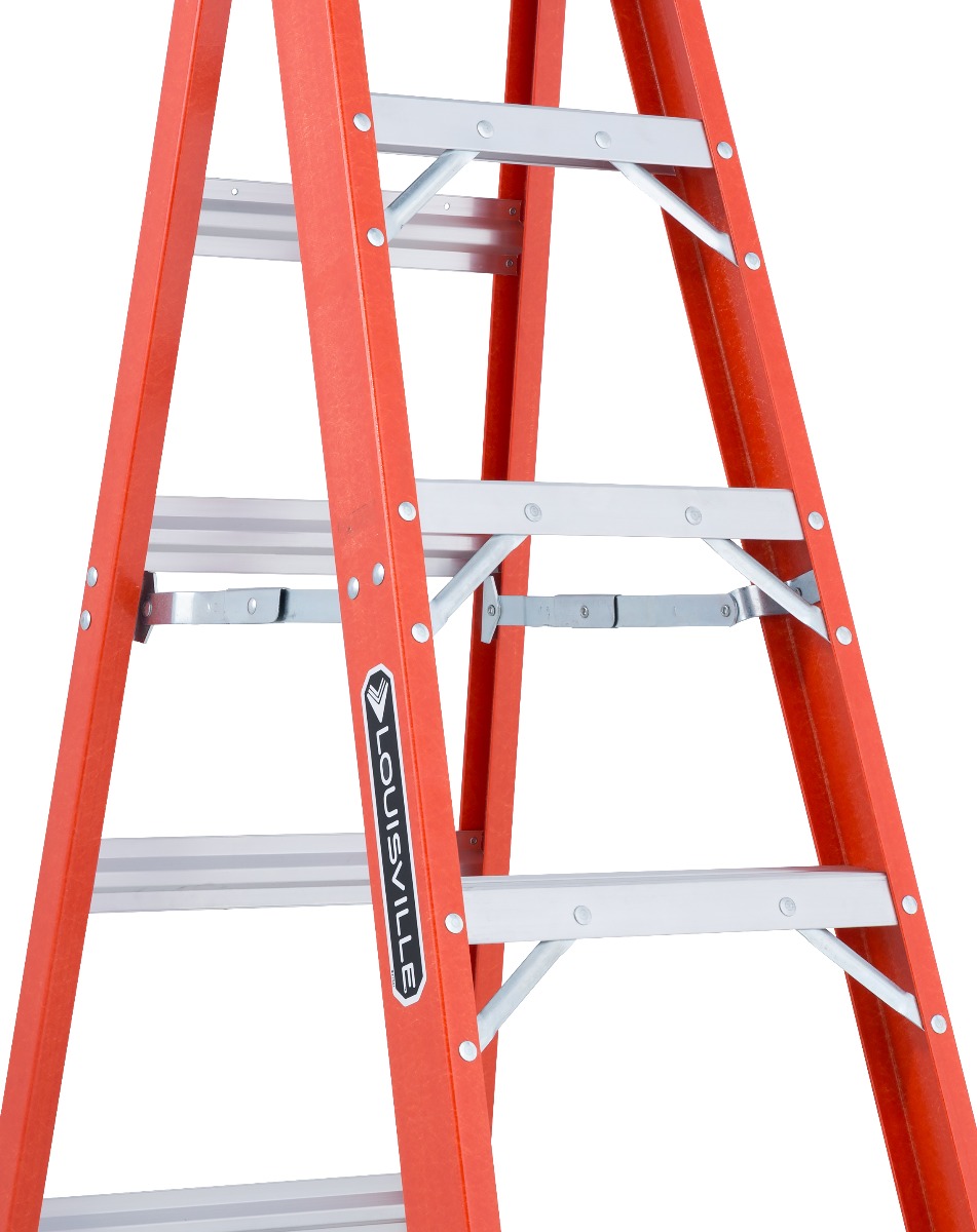 This Louisville 12 foot non-conductive fiberglass step ladder has a load capacity of 375lbs, rated ANSI Type IAA. This ladder is equipped with the innovative Raptor top with magnet and multiple tool slots, SHOX impact absorption system, Raptor boots with non-marring bonded tread mechanically fastened to the upper boot to create a secure slip-resistant footing, inside spreader braces, wide back braces, and riveted step construction with gussets. The Louisville FS1412HD step ladder meets or exceeds the safety standards set by ANSI and OSHA.