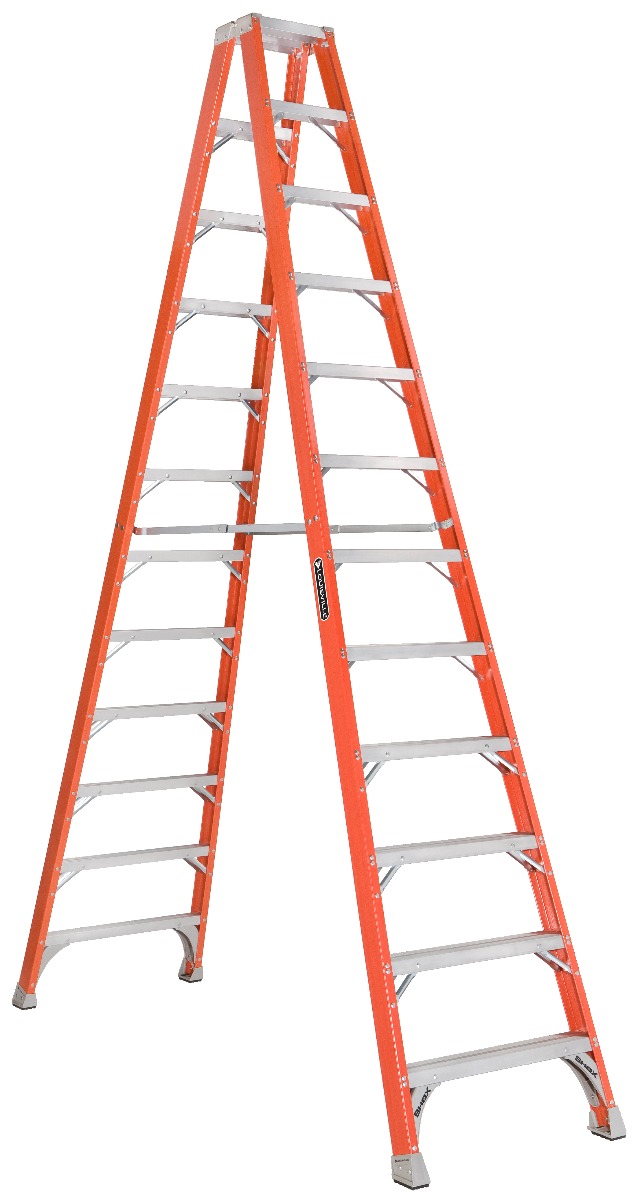 This Louisville 12 foot non-conductive fiberglass industrial twin front step ladder has a load capacity of 300lbs, rated ANSI Type IA. This ladder is equipped with Raptor Boot with non-marring bonded tread mechanically fastened to the upper boot to create a secure slip-resistant footing, SHOX impact absorption system, heavy-gauge steel hinges, inside spreader braces, and double-rivet step construction. Twin front step ladders allow two users to work on the same ladder simultaneously to easily accomplish tasks that would be more difficult for a single person. The Louisville FM1512 twin front step ladder meets or exceeds the safety standards set by ANSI and OSHA.