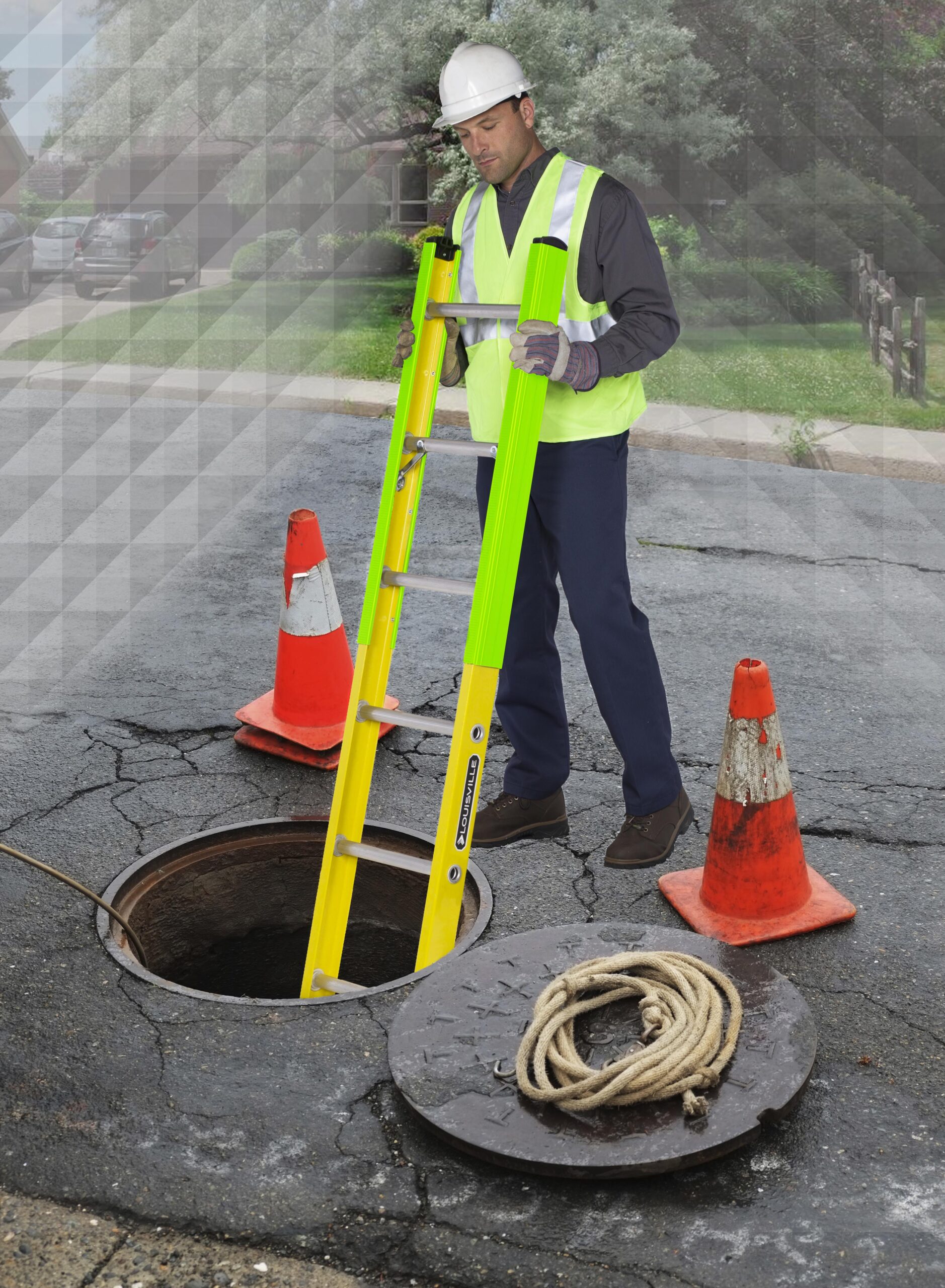 The Louisville 16 foot Manhole ladder has a 375lb load capacity, ANSI Type IAA rated. It features double side 3ft plastic rail protectors to avoid manhole rim damage, heavy duty gussets under steps and new heavy-duty 180° boots that allow you to work on either side of the ladder with thick non-marring thermoplastic elastomer tread bonded and mechanically fastened to the upper boot. The polypropylene copolymer upper boot provides strength, durability and fiberglass protection. This ladder is specially designed for use in manholes and meets or exceeds the safety standards set by ANSI and OSHA. (Item No. FE8916)
