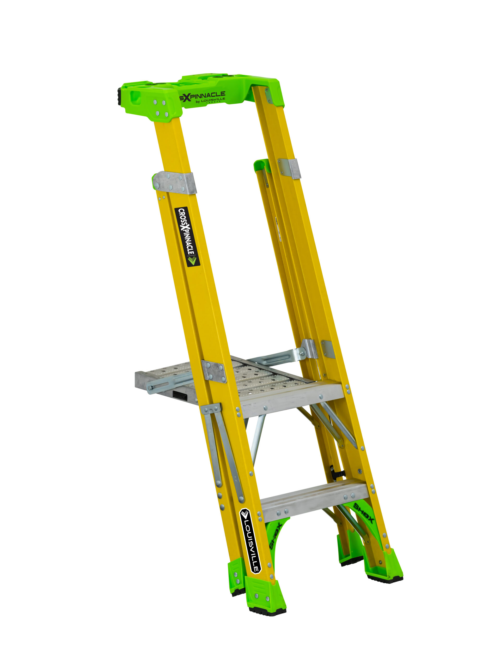 This innovation is the first of its kind. Combining the sturdiness of a platform ladder with the ability to be leaned, this Platform to Leaning 2-in-1 Cross Pinnacle Ladder is a job site must-have. Its HiVis green top and shoes make it easily identifiable to prevent fines and improve workplace safety. This 4-Foot Leaning Platform Ladder is made of superior quality and is non-conductive. The V-shape Pro Top allows the ladder to lean against walls, buildings and poles, and onto and into corners, giving it plenty of ways to improve performance when working electrical, construction, and residential jobs. The top includes a magnet tray, hardware tray, drill and tool slots, and pipe or 2×4 holder, and two tool tether anchor attachment points to secure tools with a lanyard. Louisville Ladder’s exclusive SHOX system provides extra durability and resistance to abuse and accidental mishandling; it has a 375-Pound capacity, elegant design, and a smooth finish. You won’t find a more durable, reliable ladder. As with all Louisville Ladders, it meets or exceeds the safety standards set by ANSI and OSHA.