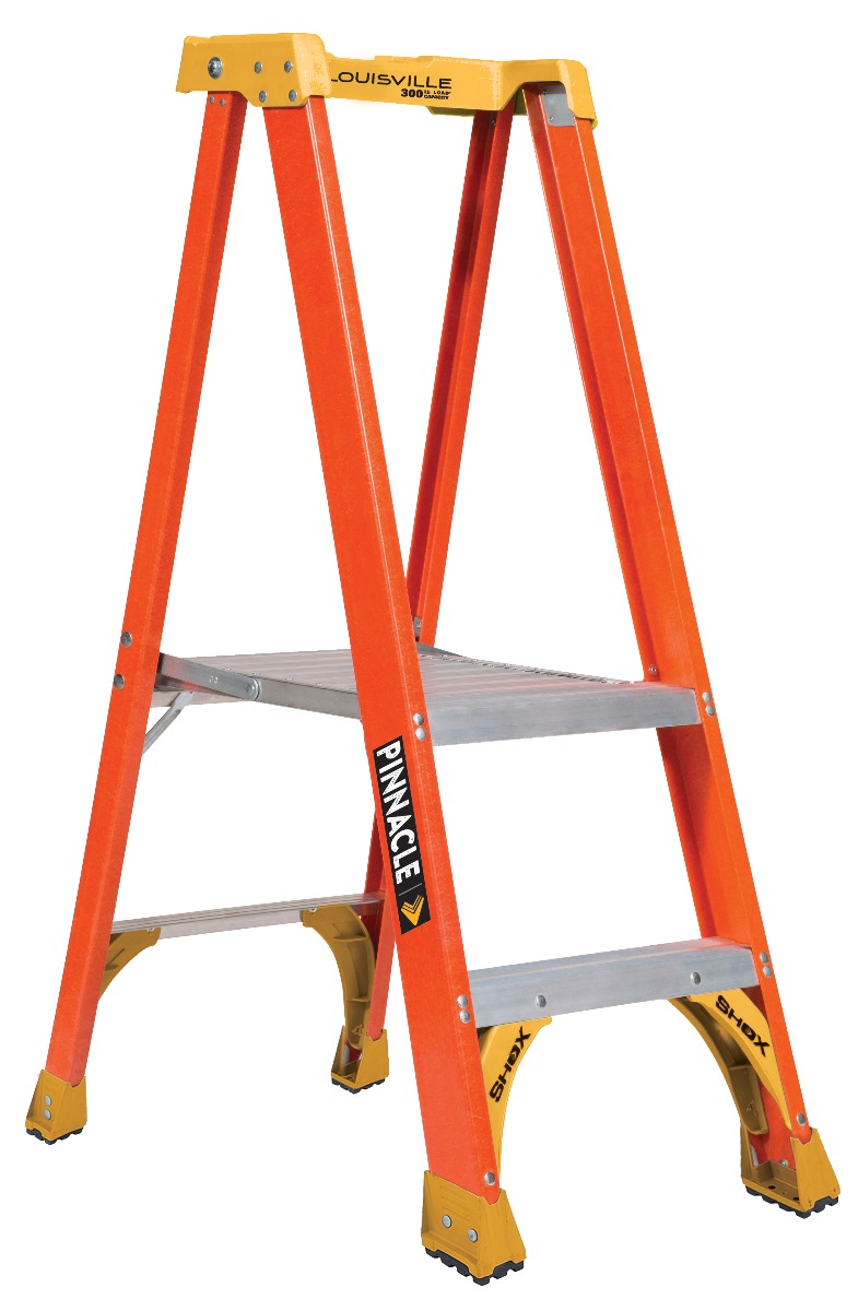 This Louisville 2 foot Pinnacle Platform step ladder has a 300lb load capacity, rated ANSI Type IA. It features a 36″ extended handrail and a 50% larger platform area for added comfort and safety. This ladder is equipped with the innovative ProTop with multiple tool slots and magnet, SHOX impact absorption system, Raptor boots with non-marring bonded tread mechanically fastened to the upper boot to create a secure slip-resistant footing, wide back braces, and double-rivet step construction. The Louisville FXP1702XL Pinnacle Platform ladder meets or exceeds the safety standards set by ANSI and OSHA.