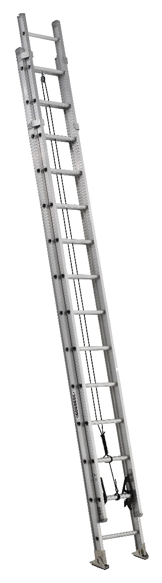 This Louisville 28 foot aluminum industrial extension ladder has a 375 pound load capacity, rated ANSI Type IAA. It is equipped with the MAXLOCK rung lock, custom engineered from a patented, advanced molecular polymer, MAXLOCK is the strongest, toughest, lightest rung lock ever made. This ladder includes the patented QuickLatch RungLock system that provides a simple, intuitive method of securing the fly and base sections of the ladder when extended. This ladder also features outside slide guides, D-shaped rungs fully serrated for a slip resistant surface, heavy duty aluminum rail end caps, rope and pulley, full I-beam for a more stable connection and to prevent twisting, and swivel safety shoes to be used with the tread down or in spike position. The Louisville AE1228HD aluminum extension ladder meets or exceeds the safety standards set by ANSI and OSHA.