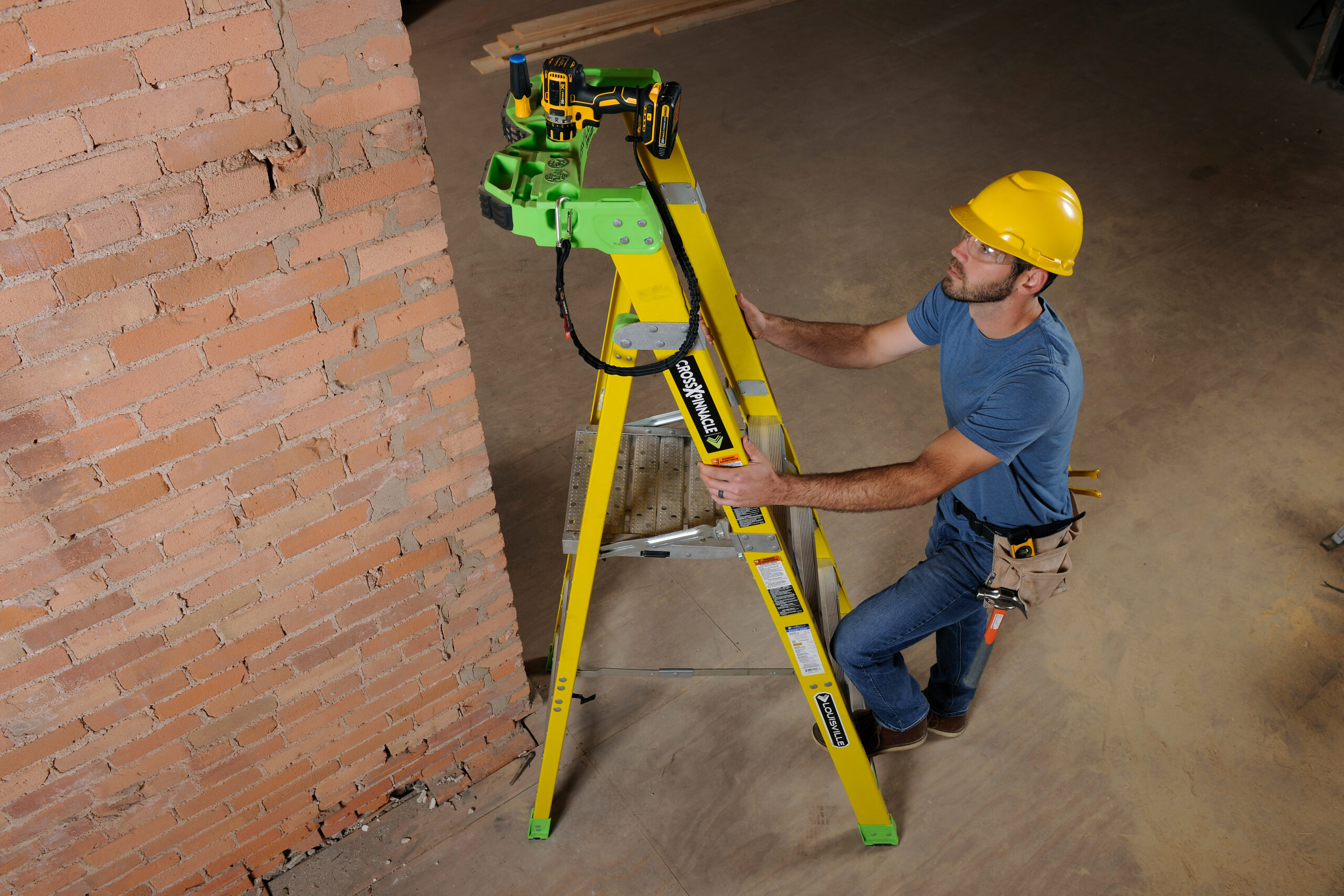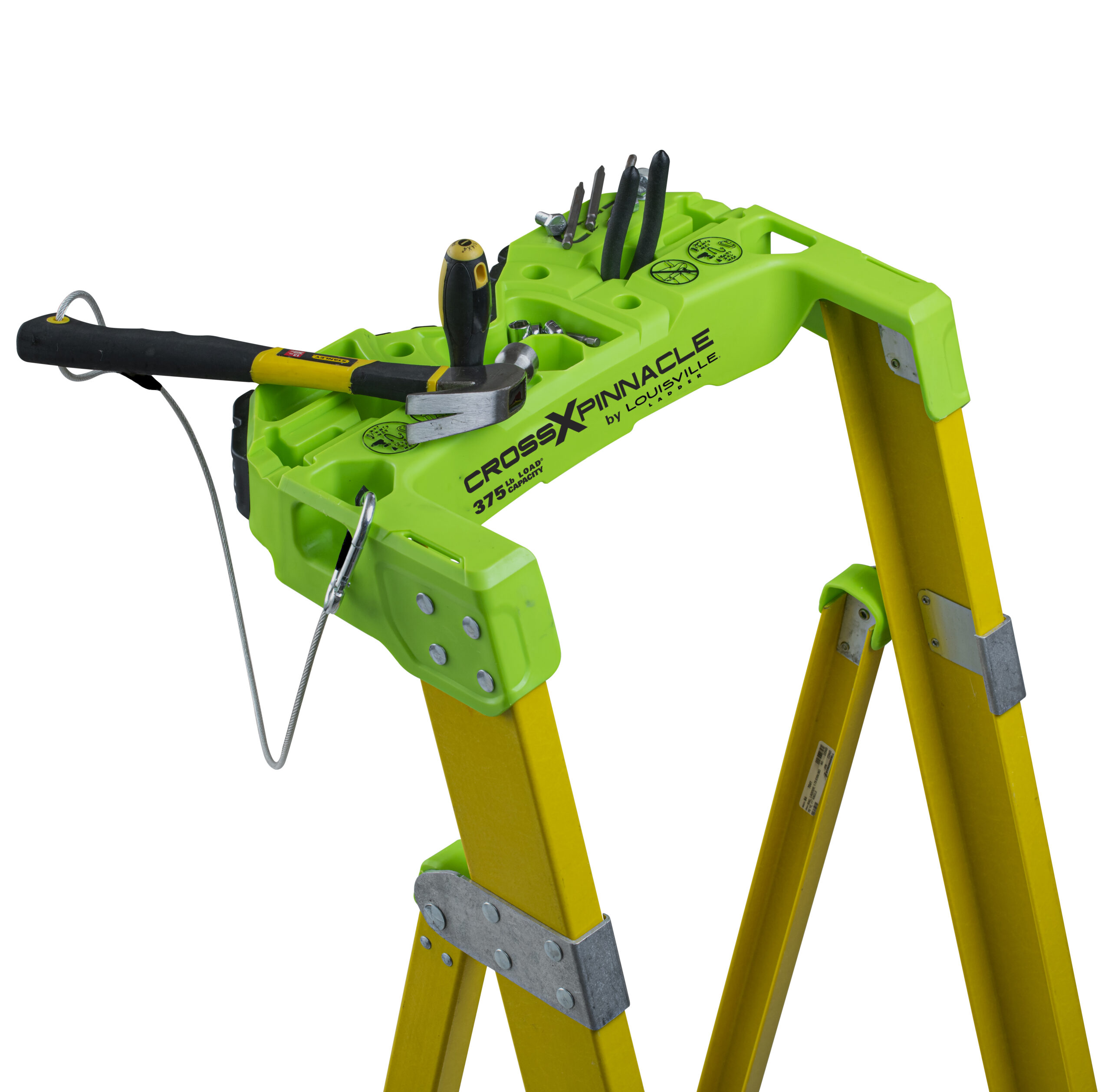 This innovation is the first of its kind. Combining the sturdiness of a platform ladder with the ability to be leaned, this Platform to Leaning 2-in-1 Cross Pinnacle Ladder is a job site must-have. Its HiVis green top and shoes make it easily identifiable to prevent fines and improve workplace safety. This 4-Foot Leaning Platform Ladder is made of superior quality and is non-conductive. The V-shape Pro Top allows the ladder to lean against walls, buildings and poles, and onto and into corners, giving it plenty of ways to improve performance when working electrical, construction, and residential jobs. The top includes a magnet tray, hardware tray, drill and tool slots, and pipe or 2×4 holder, and two tool tether anchor attachment points to secure tools with a lanyard. Louisville Ladder’s exclusive SHOX system provides extra durability and resistance to abuse and accidental mishandling; it has a 375-Pound capacity, elegant design, and a smooth finish. You won’t find a more durable, reliable ladder. As with all Louisville Ladders, it meets or exceeds the safety standards set by ANSI and OSHA.