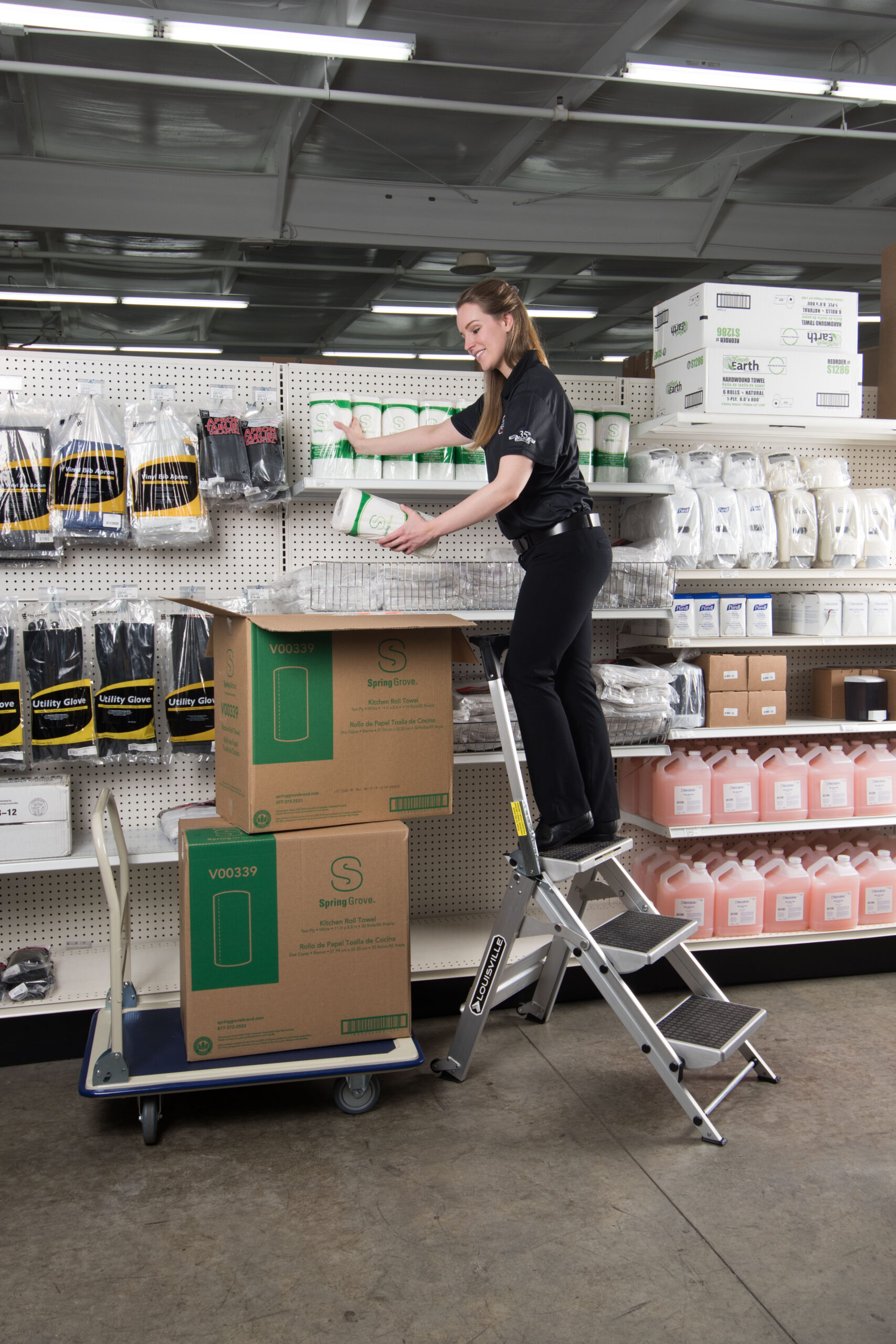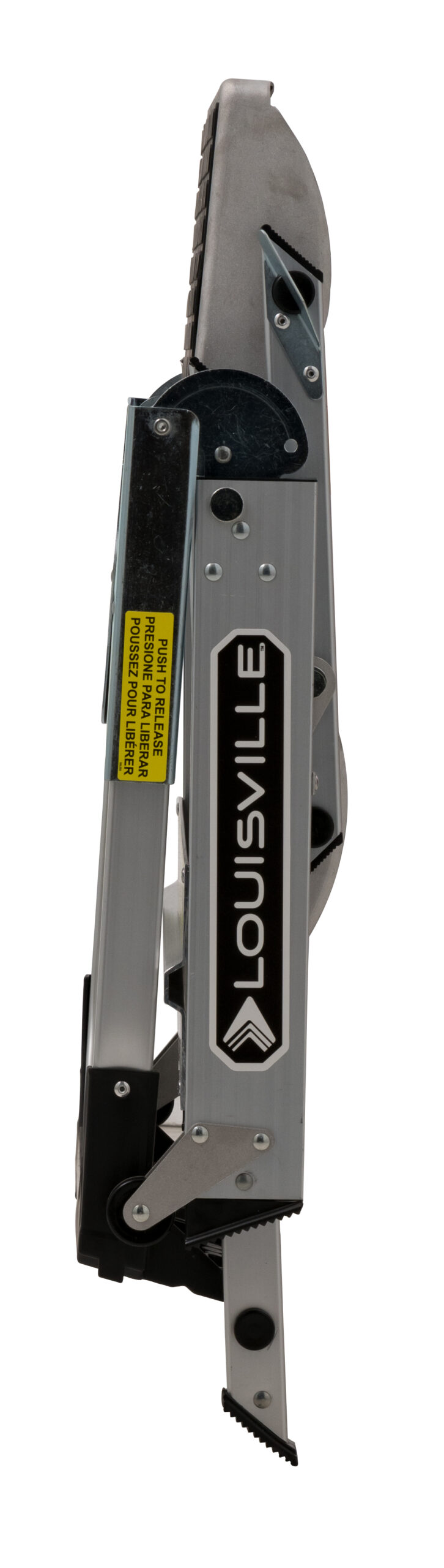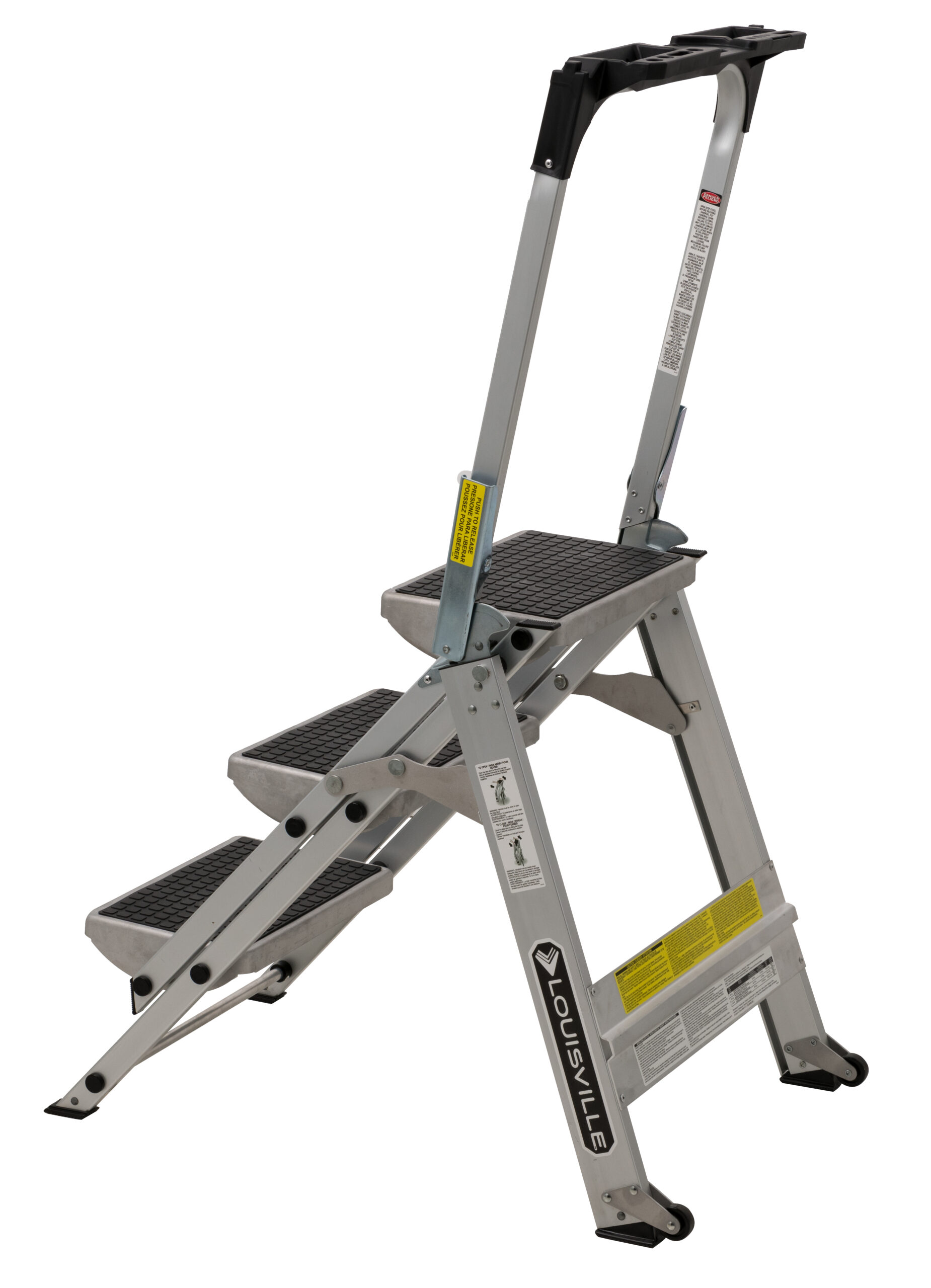 Step stool product group folding step, number of steps 3, overall height 51 in., material aluminum, ansi type ia, load capacity 300 lb., top step height 26 in., top step depth 9 in., bottom width 21-7/8 in., base depth 34 in., color Silver, finish anodize, series l-2011, closed depth 6 in., closed height 43 in., standards ansi, manufacturer’s warranty length 1 yr., ladder actuation tilt and roll, step tread anti slip vinyl, net weight 22 lb., step width 14-1/8 in., Nestable Yes
