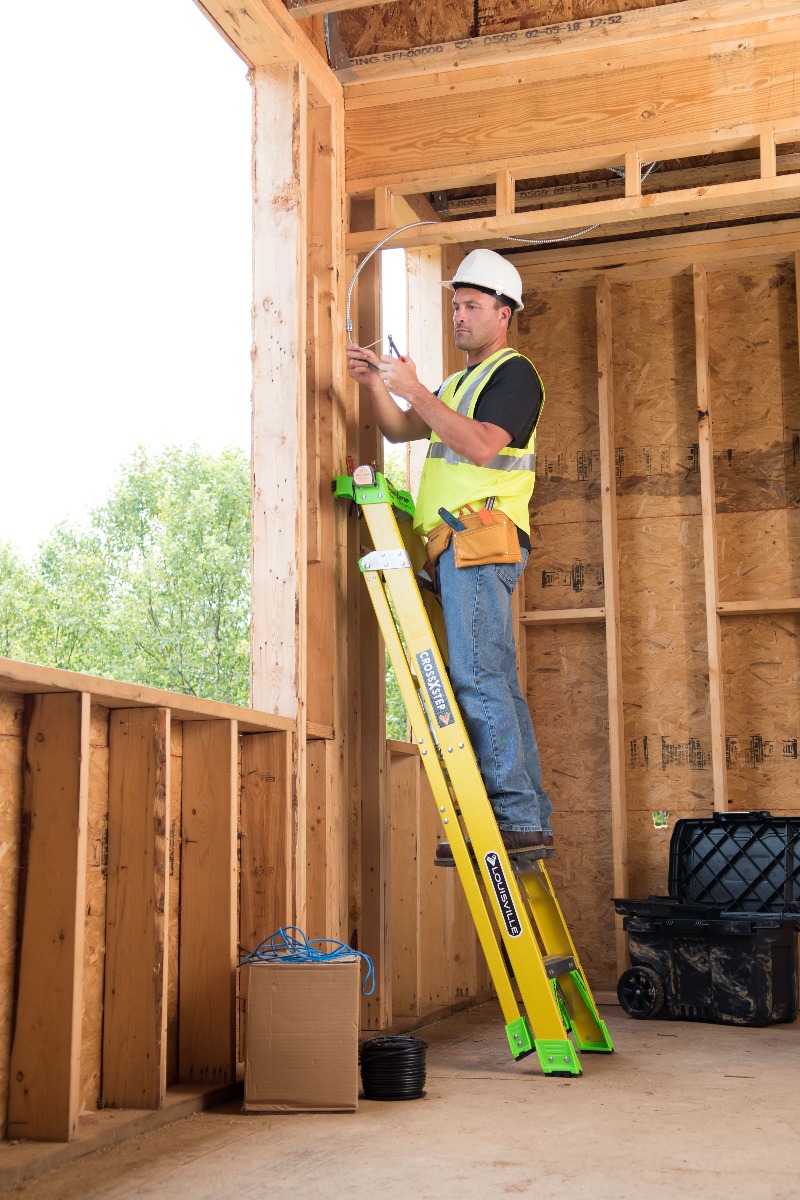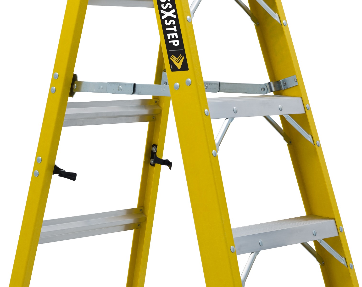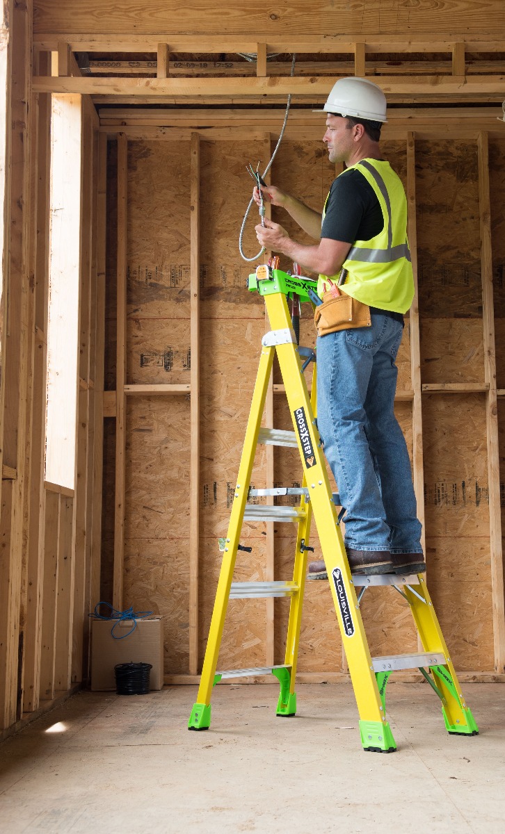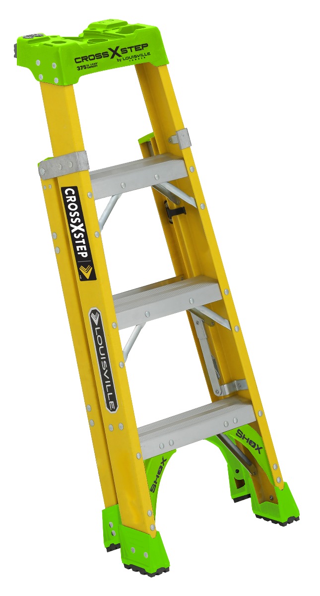 The industry changing Step-to-Extension 2-in-1 Cross Step Ladder is better than ever! Its HiVis green top and shoes makes it easily identifiable to prevent fines and improve workplace safety. SUPERIOR SAFETY: This 4-Foot Cross-Step/Shelf Ladder is made of superior quality, non-conductive fiberglass VERSATILE: Converts from a step ladder into a shelf ladder for a 2 in 1 combination in order to get closer to the work area PATENTED PRO-TOP SYSTEM: V-shape Pro Top allows the ladder to lean against walls, buildings and poles; and has plenty of features to improve performance when working electrical, construction, and residential jobs. It includes a magnet tray, hardware tray, drill and tool slots, and pipe or 2×4 holder. EQUIPPED WITH SHOX SYSTEM: Louisville Ladder exclusive SHOX system provides extra durability and resistance to abuse and accidental mishandling. STURDY AND STRONG: With its 375-Pound capacity, elegant design and smooth finish, you won’t find a more durable, reliable ladder. ABOVE AND BEYOND SAFETY STANDARDS: This ladder meets or exceeds the safety standards set by ANSI and OSHA.