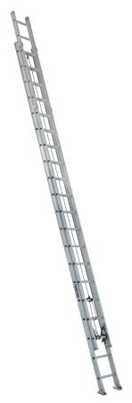 This Louisville 40 foot aluminum industrial extension ladder has a 300 pound load capacity, rated ANSI Type IA. It is equipped with the MAXLOCK rung lock, custom engineered from a patented, advanced molecular polymer, MAXLOCK is the strongest, toughest, lightest rung lock ever made. This ladder includes the patented QuickLatch RungLock system that provides a simple, intuitive method of securing the fly and base sections of the ladder when extended. This ladder also features outside slide guides, D-shaped rungs fully serrated for a slip resistant surface, heavy duty aluminum rail end caps, rope and pulley, full I-beam for a more stable connection and to prevent twisting, and swivel safety shoes to be used with the tread down or in spike position. The Louisville AE1240 aluminum extension ladder meets or exceeds the safety standards set by ANSI and OSHA.