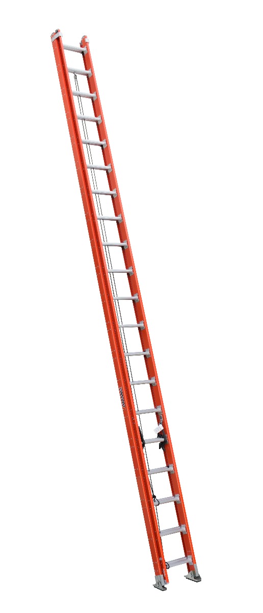 This Louisville 40 foot fiberglass extension ladder has a 300lb load capacity, rated ANSI Type IA. It is equipped with the MAXLOCK rung lock, custom engineered from a patented, advanced molecular polymer, MAXLOCK is the strongest, toughest, lightest rung lock ever made. This ladder includes the patented QuickLatch RungLock system that provides a simple, intuitive method of securing the fly and base sections of the ladder when extended. This ladder features aluminum rung connector plates, outside slide guides, D-shaped rungs fully serrated for a slip resistant surface, non-marring rail end caps, rope and pulley, and full heavy duty metal boot with steel swivel safety shoes to be used with the tread down or in spike position. The Louisville FE7240 fiberglass extension ladder meets or exceeds the safety standards set by ANSI and OSHA.