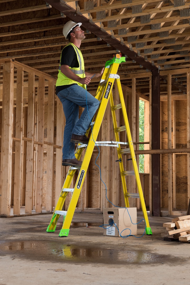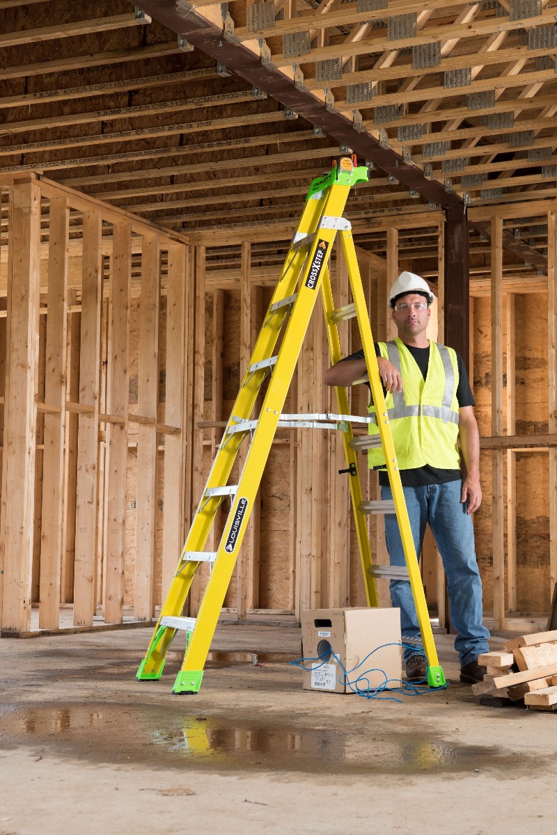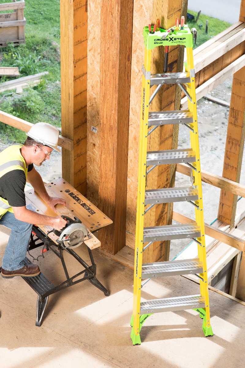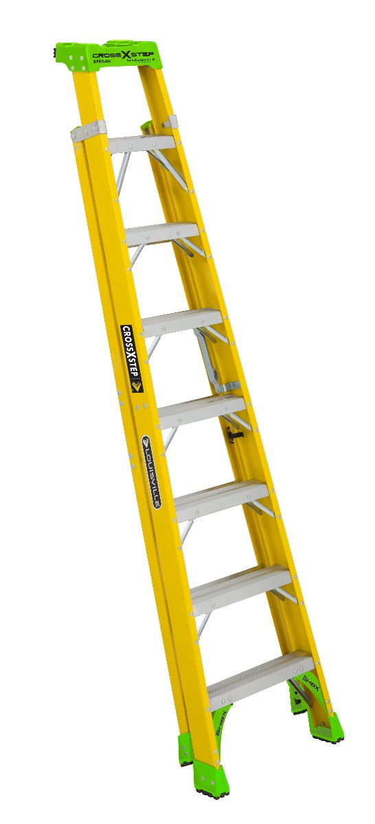 The industry changing Step-to-Extension 2-in-1 Cross Step Ladder is better than ever! Its HiVis green top and shoes makes it easily identifiable to prevent fines and improve workplace safety. SUPERIOR SAFETY: This 8-Foot Cross-Step/Shelf Ladder is made of superior quality, non-conductive fiberglass VERSATILE: Converts from a step ladder into a shelf ladder for a 2 in 1 combination in order to get closer to the work area PATENTED PRO-TOP SYSTEM: V-shape Pro Top allows the ladder to lean against walls, buildings and poles; and has plenty of features to improve performance when working electrical, construction, and residential jobs. It includes a magnet tray, hardware tray, drill and tool slots, and pipe or 2×4 holder. EQUIPPED WITH SHOX SYSTEM: Louisville Ladder exclusive SHOX system provides extra durability and resistance to abuse and accidental mishandling. STURDY AND STRONG: With its 375-Pound capacity, elegant design and smooth finish, you won’t find a more durable, reliable ladder. ABOVE AND BEYOND SAFETY STANDARDS: This ladder meets or exceeds the safety standards set by ANSI and OSHA.