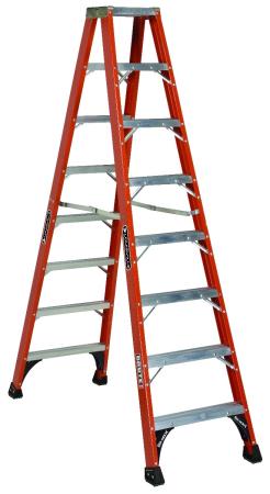 This Louisville 8 foot non-conductive fiberglass industrial twin front step ladder has a load capacity of 375lbs, rated ANSI Type IAA. This ladder is equipped with DaBoot with non-marring bonded tread mechanically fastened to the upper boot to create a secure slip-resistant footing, SHOX impact absorption system, heavy-gauge steel hinges, heavy-duty gusset bracing, inside spreader braces, and riveted step construction. Twin front step ladders allow two users to work on the same ladder simultaneously to easily accomplish tasks that would be more difficult for a single person. The Louisville FM1408HD twin front step ladder meets or exceeds the safety standards set by ANSI and OSHA.